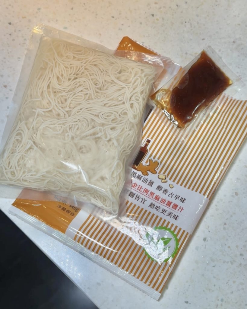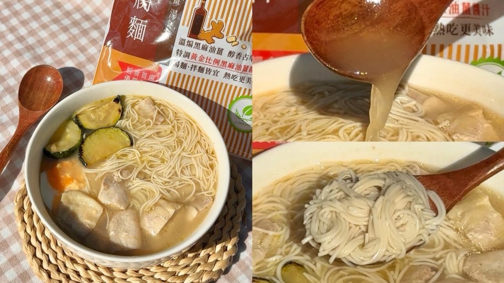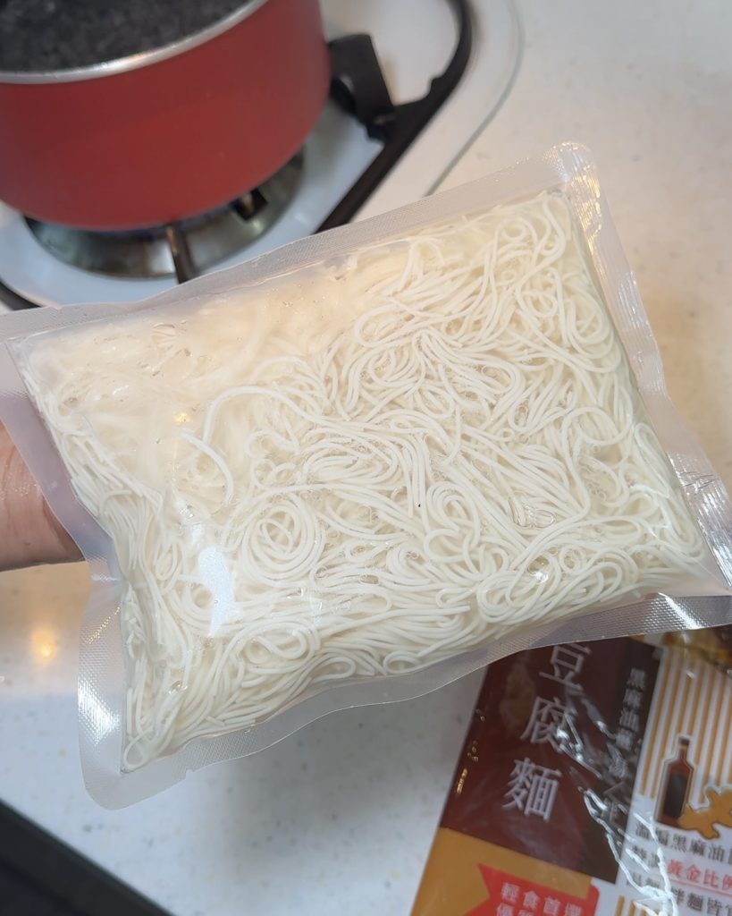 ▼【紀文黑麻油薑豆腐麵】主打方便快速,裏頭內含一包豆腐麵+一包黑麻油,可以煮成熱湯麵或是熱拌麵,只要微波兩分鐘或在鍋中煮就能完成!