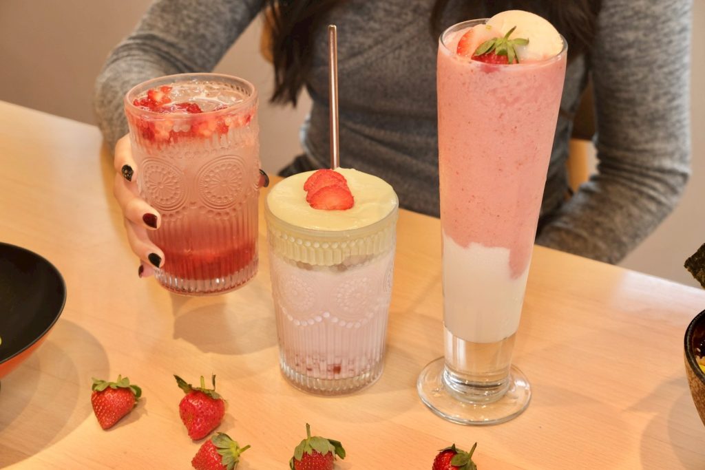 草莓冰沙💰160元 草莓歐蕾💰160元 草莓氣泡飲💰140元