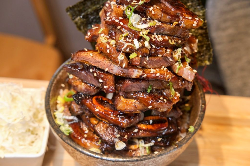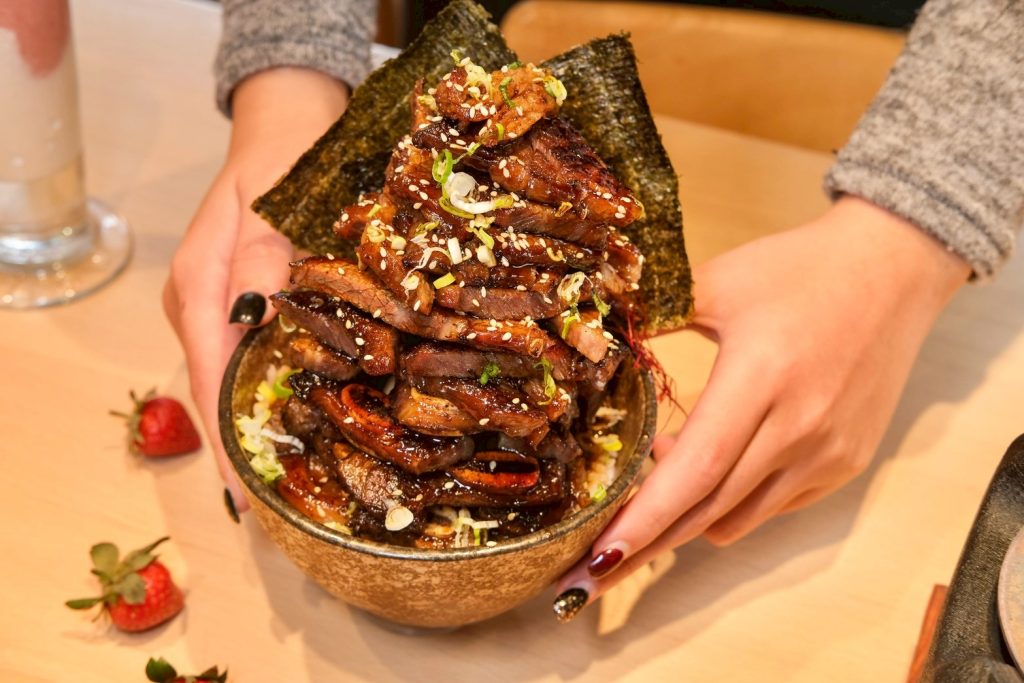 ▼同樣充滿視覺效果!這碗特上帶骨牛小排丼飯定食,由四塊厚切帶骨牛小排堆成的小山,實在讓人太震撼,在大火燒烤下香氣十足,微焦肉汁咬下去滿嘴噴發,,肉肉控絕對會愛慘!
