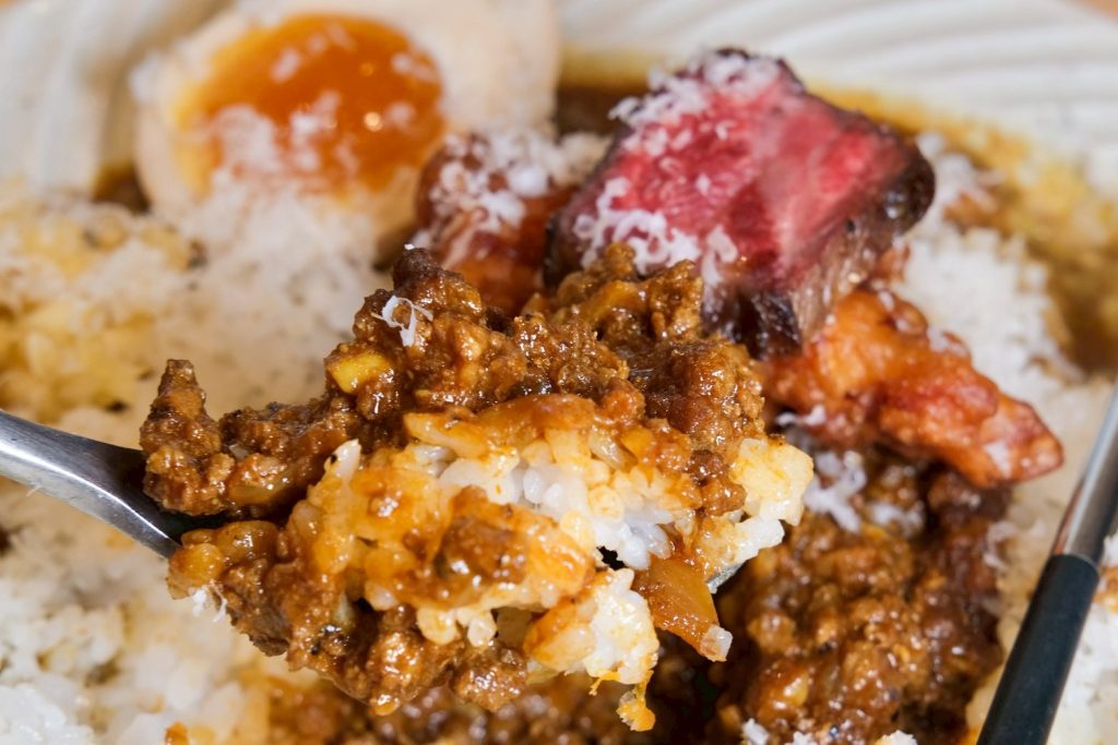 ▼雙醬咖哩系列可以吃到兩種咖哩,內圈是嚴選多種香料熬煮的乾咖哩,可以吃到番茄的酸甜和洋蔥的甘甜,外圍還有日式熟成咖哩,超級濃郁並帶有牛肉香,還會在桌邊刨上滿滿的帕瑪森起司,只能說真的爽度十足!