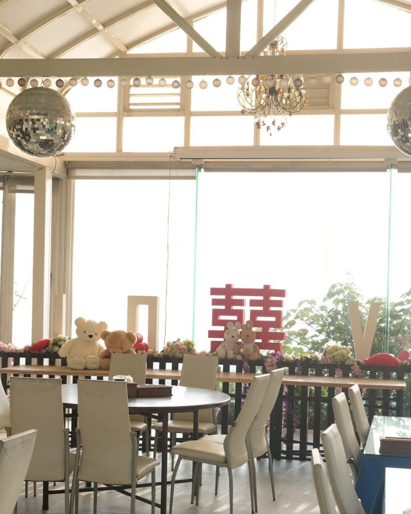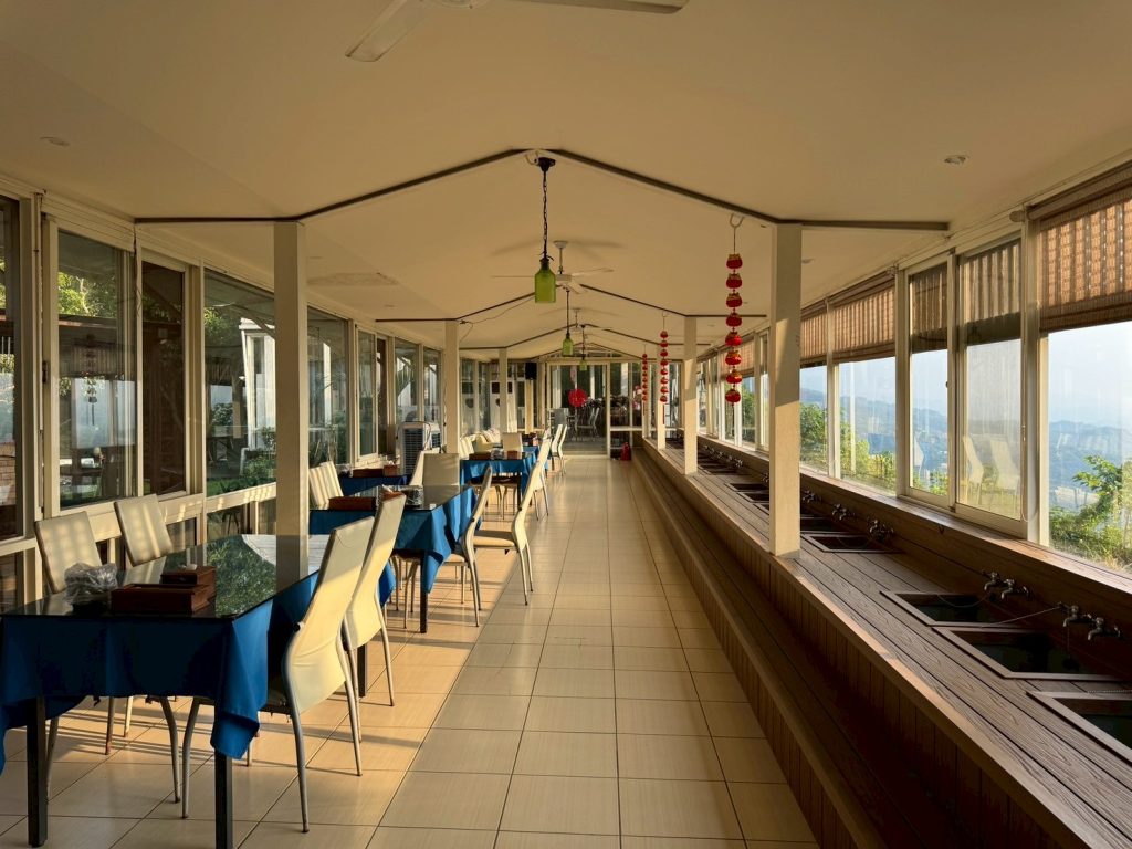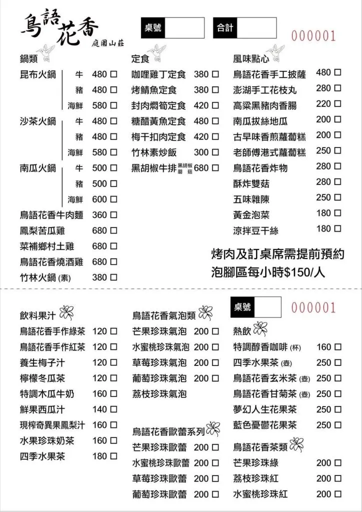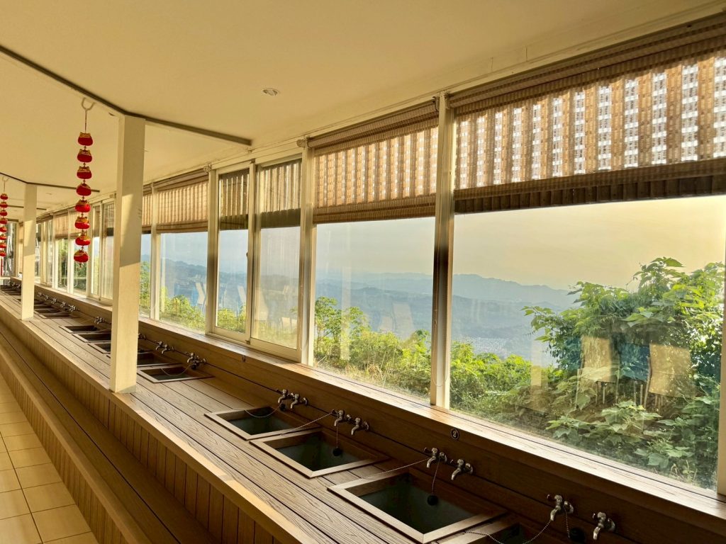 ▼【鳥語花香庭園山莊】用餐區域分為室內和室外,都可以一覽台中市百萬級的夜景,室內最特別還有泡腳足湯,湯池會附上中藥包療癒身心,邊泡腳邊看夜景有夠享受,另外也有大型宴會廳供聚會婚宴使用。
