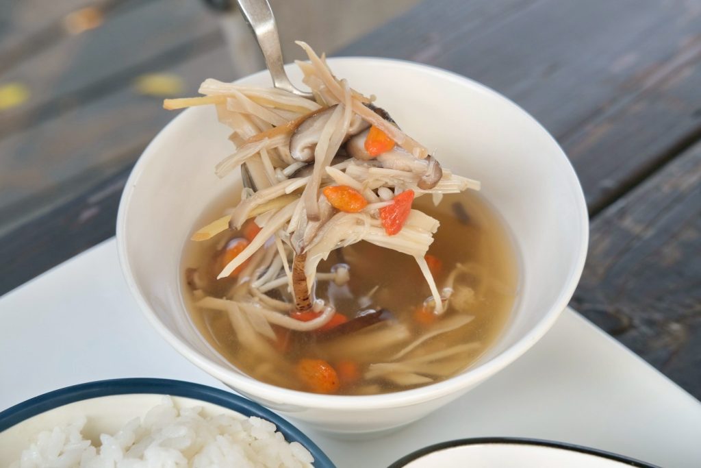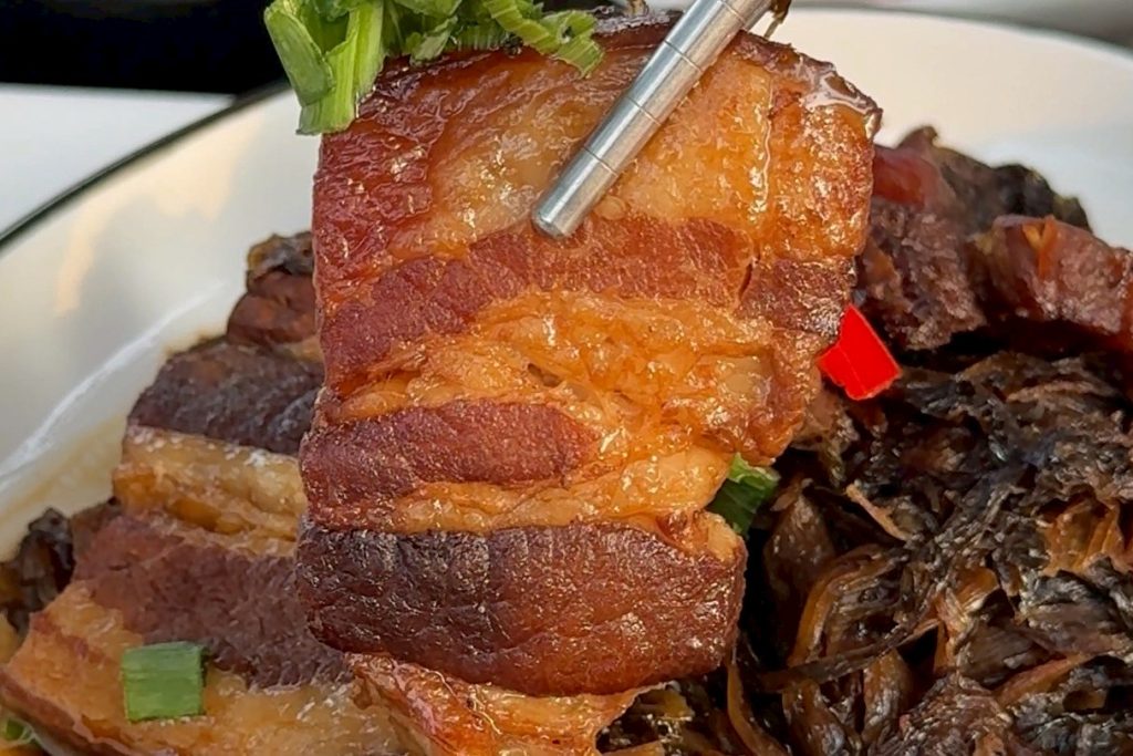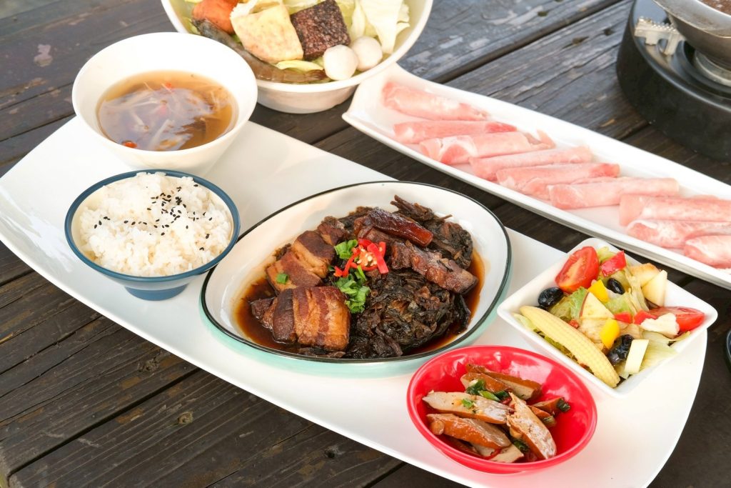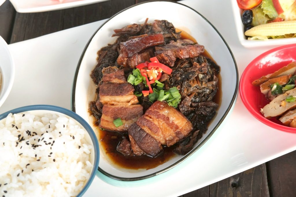▼香噴噴的梅干扣肉定食,是許多餐館才會出現的功夫菜,看看這黝黑的色澤,就知道有多麼厲害,燉到軟爛的梅干扣肉,鹹鹹香香好夠味,是一道十足的白飯殺手,搭配多款小菜和米飯享用,吃完整個讓人超級飽!