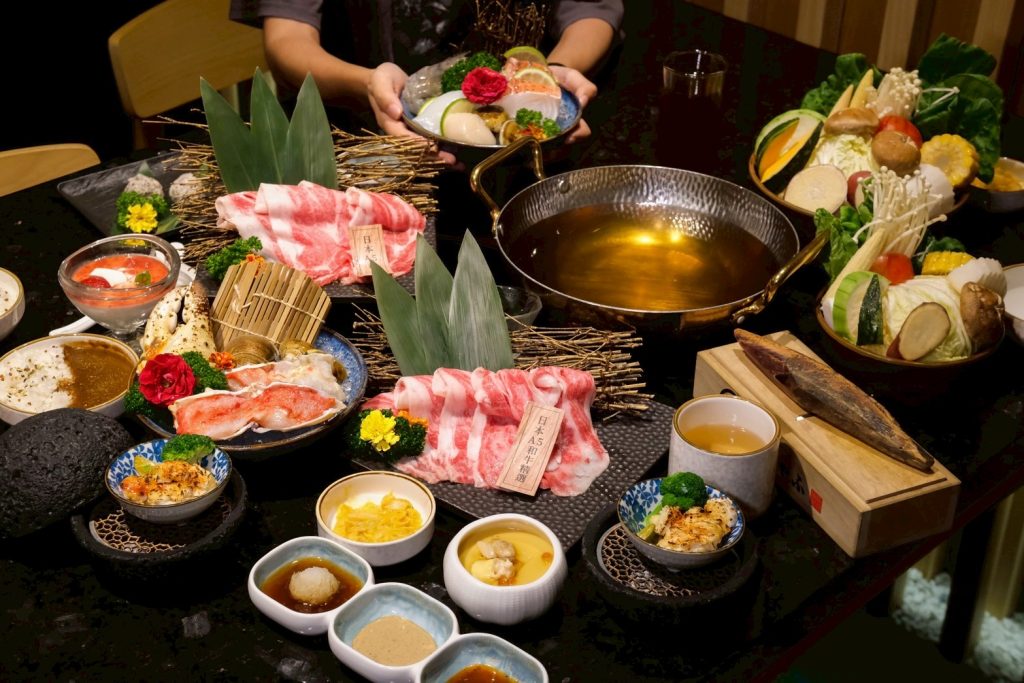 ▼輕奢帝王鍋包含季節菜盤、米飯、日本和牛、帝王蟹海鮮盤、茶碗蒸、小菜、醬料、和甜點。