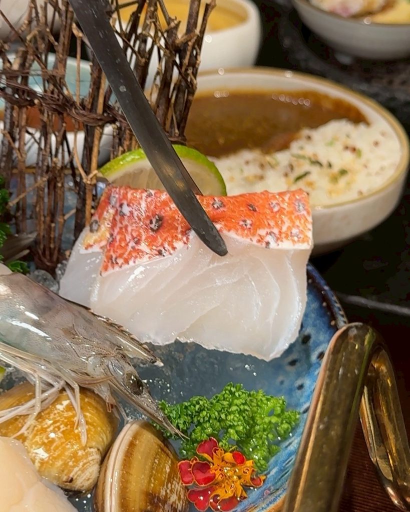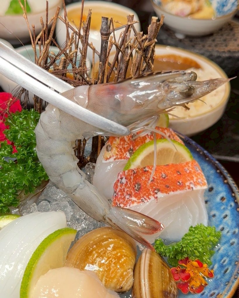 ▼只要加價兩百多就能升級海鮮盤,可以吃到北海道生食級干貝 、藍鑽蝦 、台灣海大蛤 、紋甲花枝 、季節鮮魚 ,這食材超划算絕對要加購啊,每一樣都很新鮮,超愛北海道生食級干貝軟嫩的口感!