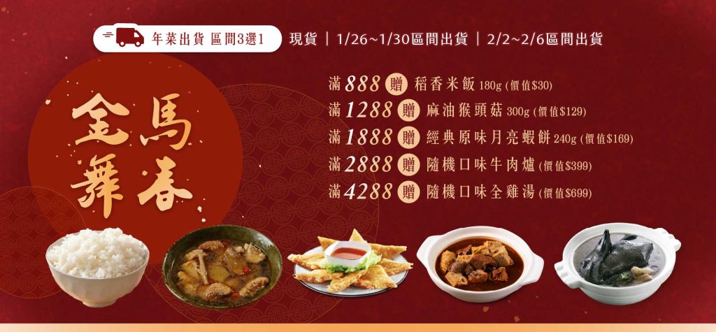 滿888送稻香米飯、滿1288送麻油猴頭菇、滿1888送經典月亮蝦餅、滿2888送隨機口味牛肉爐,滿4288再送隨機口味全雞湯!