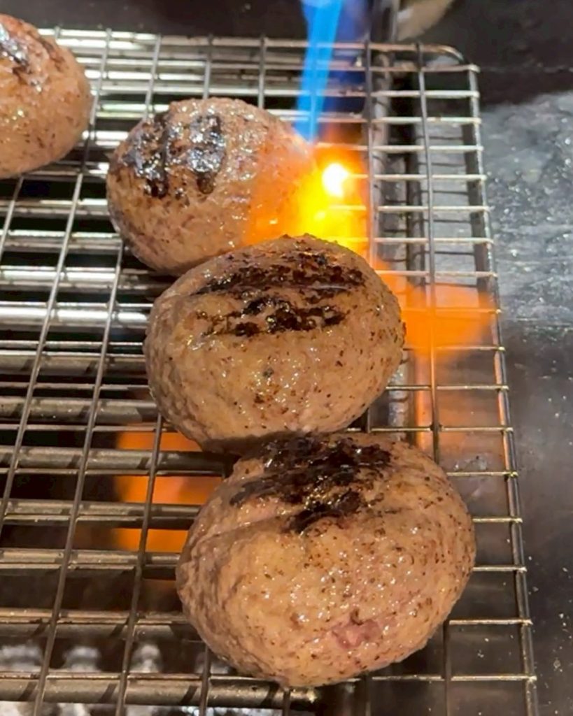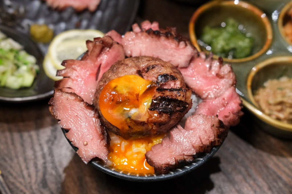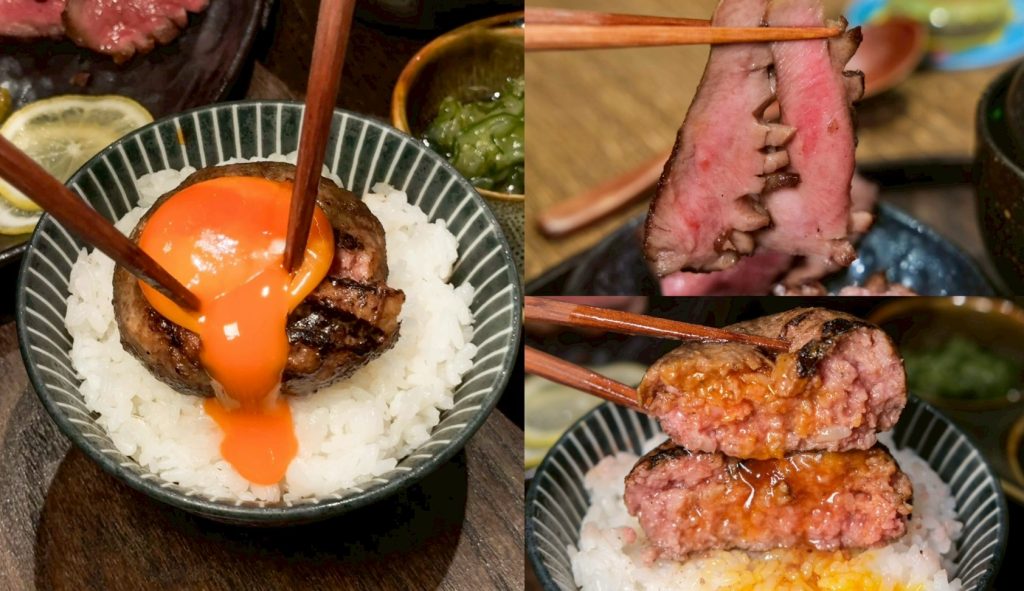 ▼每日限量的厚切牛舌和牛挽肉,可以吃到粉嫩的牛舌和厚實牛挽肉,使用日本山形牛後腿肉製作漢堡排,直火炭烤搭配噴槍炙燒,還沒吃就聞到迷人香氣,一咬下肉汁更是瞬間狂噴,配上生蛋黃好吃到會銷魂。
