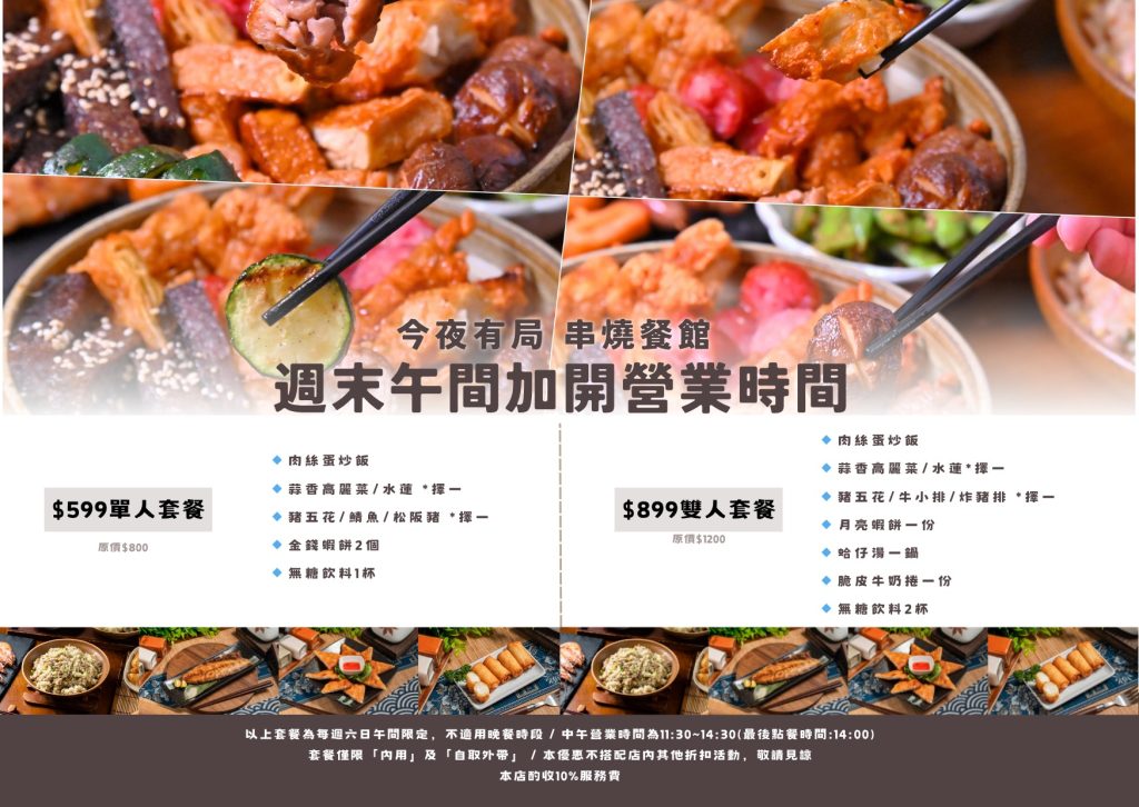 台中人聚會餐廳再加一 ! 有得吃有得喝又有得玩的【今夜有局串燒餐酒館】,主打可以自己拿的銅板價串燒,現在周末加碼中午就開始營業,推出超划算百元套餐組合,還有生啤酒買二送一活動,讓你一大早就開始嗨!