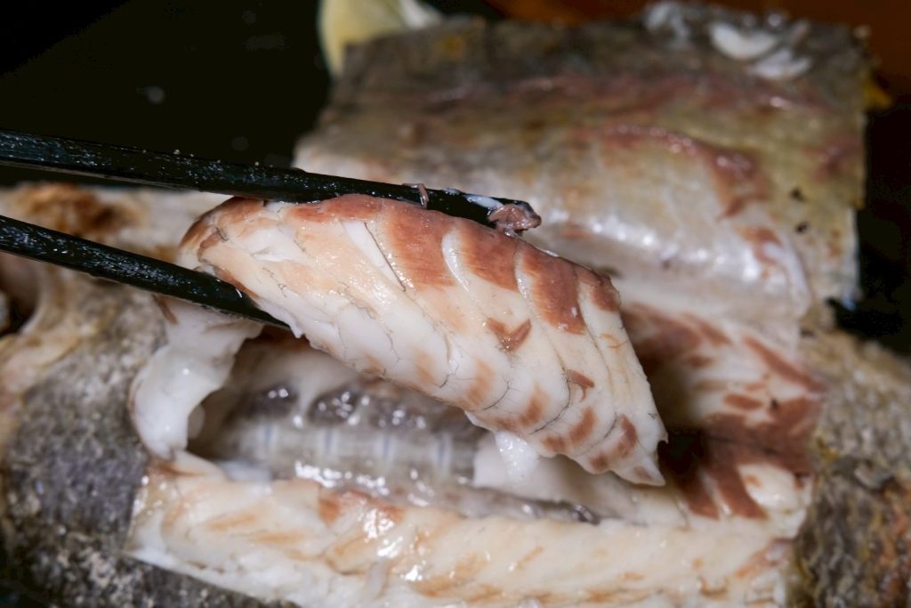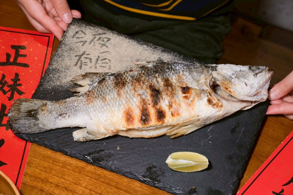 ▼每桌必點的鹽烤鱸魚 ,食材都是當日新鮮採買,吃起來肉質細膩,而且非常多汁,重點是沒有腥味,整尾直接被我們吃光光!
