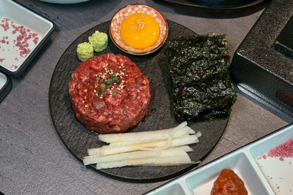 ▼敢吃生食要試看看生拌韓牛肉,加了特製的調味醬料與生雞蛋攪拌均勻,再加上水梨絲用紫菜包著一起吃,清爽的口感實在太有趣~
